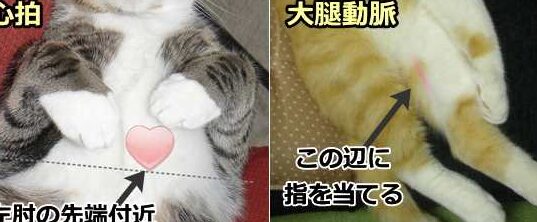 - 脈拍チェック: 猫の足の付け根や内股の動脈の脈を触って、心拍数を測定します。